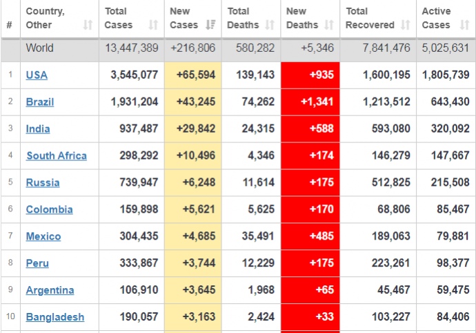 В США за минувшие сутки диагностировали 65 594 (935 пациентов умерло) случаев коронавируса, в Бразилии 43 245 (1341 умерло), в Индии 29 842 (588 умерло), ЮАР 10496 (174 умерло), власть в России, которую подозревают в скрываемые статистики по количеству больных, отчитывается о 6248 случаев коронавируса (175 умерло за сутки) и другие.