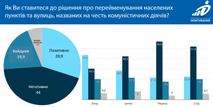 Позитивное отношение к переименованию топонимов преобладает только в Западном регионе (44% "за" и 30% "против"), на Востоке и Юге около половины граждан относятся к переименованию отрицательно.