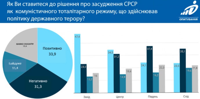 34% украинцев соглашаются с осуждением СССР как коммунистического тоталитарного режима, который осуществлял политику государственного террора, около 31% не поддерживают такое решение.