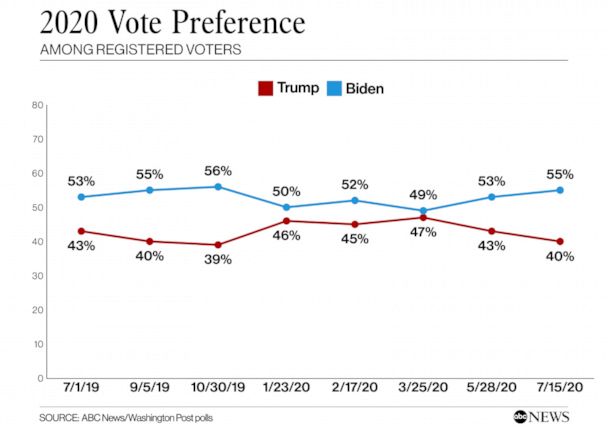 Телефонный опрос по заказу ABC News и Washington Post проводился 12-15 июля 2020 года на английском и испанском языках. Было опрошено 1006 взрослых, в том числе 845 зарегистрированных избирателей. Погрешность выборки составляет 3,5% для всех опрошенных и 4% для зарегистрированных избирателей.