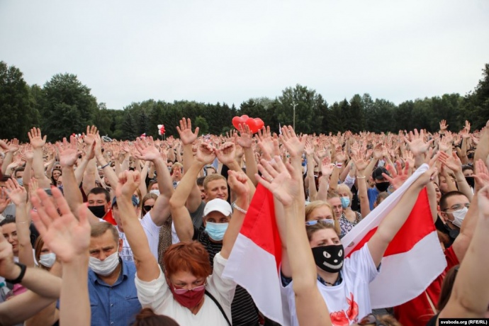 В агитационном митинге в поддержку кандидата в президенты Беларуси, жены политзаключенного блогера Сергея Тихановского Светланы Тихановской в Минске приняли участие около 7,5 тысяч человек.