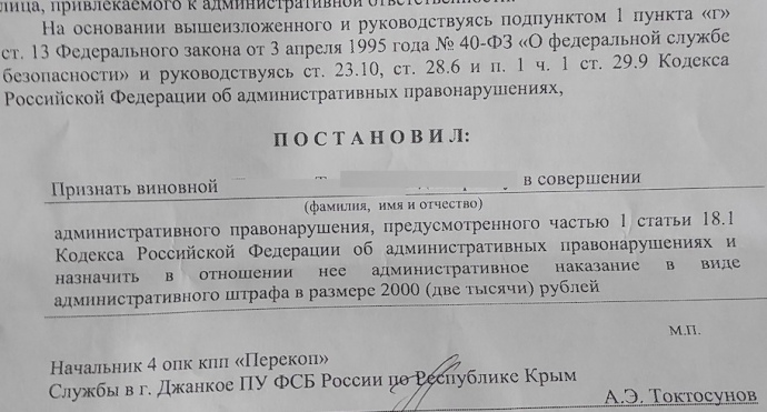 Детали: При въезде на оккупированный полуостров ФСБ требует от крымчан предъявлять российский паспорт. Если у жителя Крыма нет с собой российского паспорта, а есть только украинский, сотрудники погрануправления ФСБ РФ выносят постановление о назначении административного наказания.