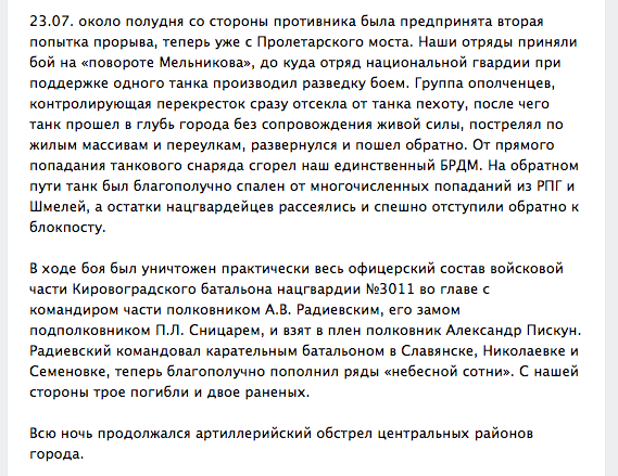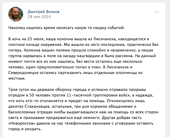 В 2014 году он также описывал свое участие в том же бою, о котором говорит украинская прокуратура и публиковал фото документов украинских военных. На данный момент занимается производством соков.