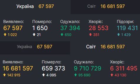За сутки 28 июля COVID-19 в Украине диагностировали 1022 людям, 21 больной умер, а 650 человек выздоровели.