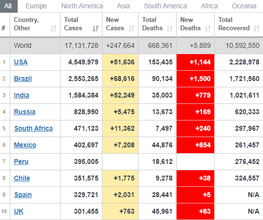 За время пандемии коронавируса в мире зафиксировали 17 миллионов 131 тысячу случаев заболевания, хотя 16 миллионов зафиксировали лишь четыре дня назад.