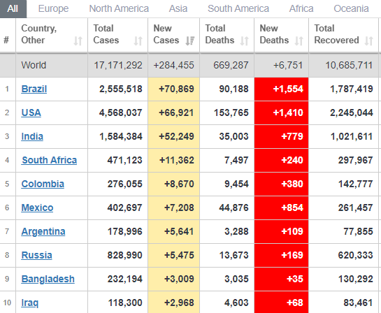 Детали: Этими сутками Бразилия опередила США по количество новых случаев заболевания: 70,8 тысяч против 67 тысяч.