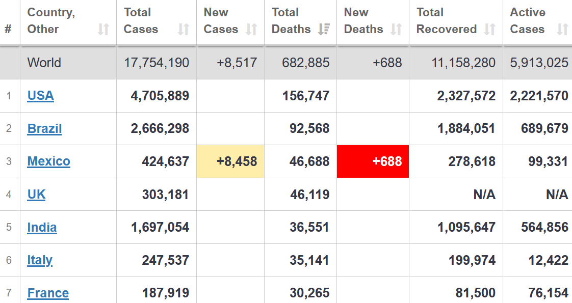 Детали: По состоянию на сейчас в мире зафиксировали 17 миллионов 754 тысячи случаев заболевания. Только за прошедшие сутки количество заболеваний выросло на 282 171.