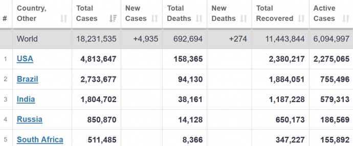 По состоянию на сейчас в мире зафиксировано 18,2 миллиона случаев заражения, из них 218 тысяч только за минувшие сутки.