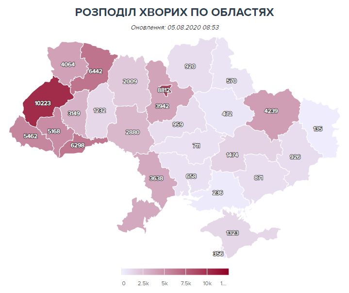 Активных больных, по данным СНБО, сейчас больше всего во: Львовской области (7 319), Киеве (5 585), Ивано-Франковской области (3 167), Закарпатской области (3 061) и Одесской области (2 213).