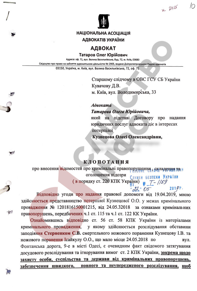 Как следует из документа, датированного 17 мая 2019 года, Олег Татаров представлял интересы Олеси Кузнецовой — жены Ивана Кузнецова, который погиб в мае 2018 года от ножевых ранений в результате стычки со Стерненком возле дома последнего в Одессе. Еще один мужчина - Александр Исайкул - тогда получил ранения.