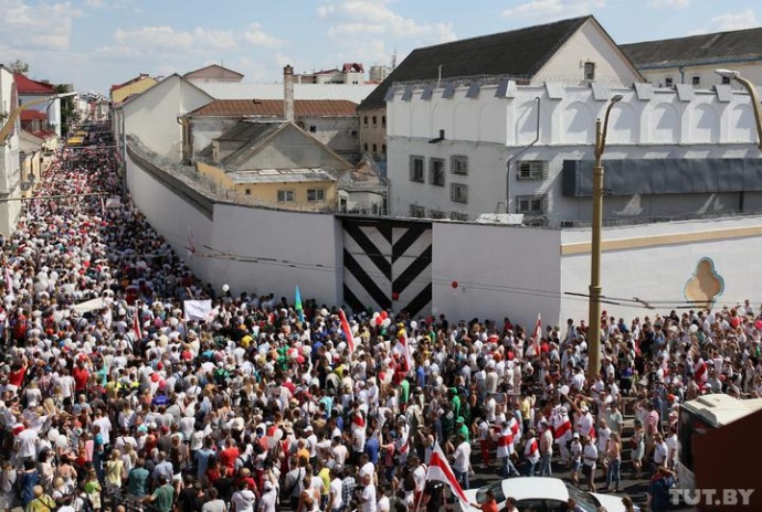 Детали: Многотысячная толпа скандирует: "Уходи!", "Верам, можам, переможам!", "Лукашенко в автозак!", "Честные выборы!".