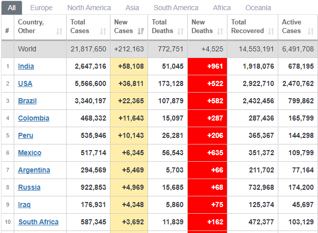 За последние сутки в мире обнаружили 212 тысяч новых случаев заражения и зафиксировали 4525 смертей.