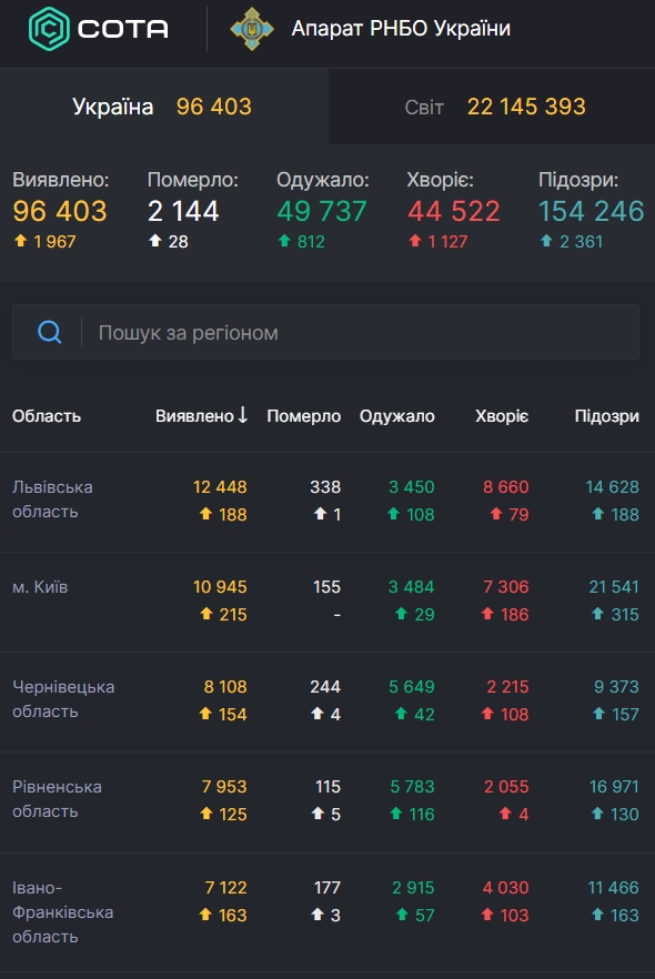 Детали: Больше всего новых случаев за сутки зафиксировано в: Харьковской области (247), Киеве (215), Львовской области (188), Ивано-Франковской области (163), Черновицкой области (154), Ровенской области (125), Одесской области (123), Закарпатской области (117).