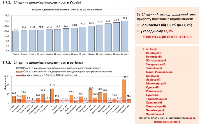 Эпидемическая ситуация с COVID-19 ухудшается в Киеве, Винницкой, Волынской, Житомирской, Закарпатской. Запорожской, Ивано-Франковской, Киевской, Львовской, Николаевской, Одесской, Ровенской, Сумской, Тернопольской, Харьковской, Хмельницкой, Черновицкой и Черниговской областях.