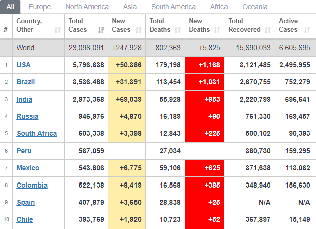 Пандемия: в мире уже 23 млн случаев коронавируса