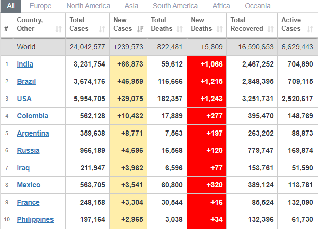 За последние сутки в мире обнаружили почти 240 тысяч новых случаев заражения. Из них почти 67 тысяч в Индии, 47 тысяч в Бразилии и 39 тысяч в США. В этот же день умерли 5809 больных.