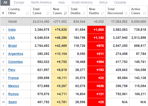 За последние сутки COVID-19 обнаружили у 271 тысячи людей. В частности, в Индии заболели почти 77 тысяч человек, в США – 46 тысяч, в Бразилии – 42 тысячи, в Аргентине – 10 тысяч, в Колумбии – 9,7 тысяч, в Перу – 8,6 тысяч, во Франции – 6 тысяч.