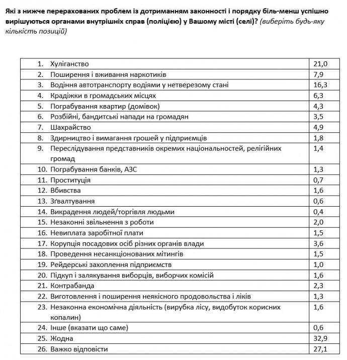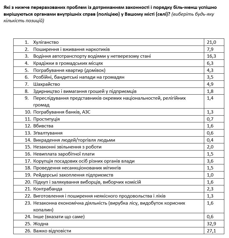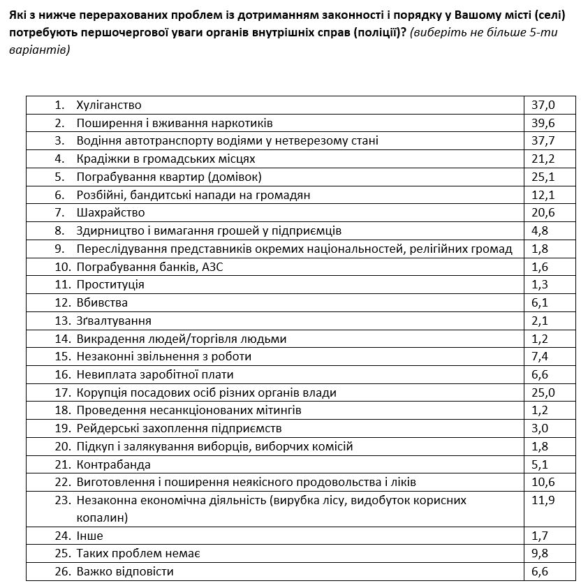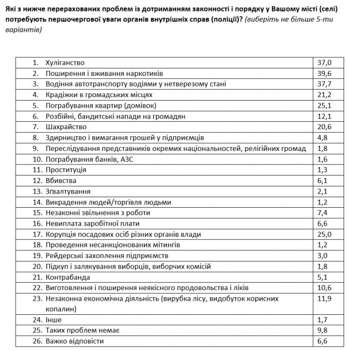 На распространение и употребление наркотиков жаловались большинство респондентов южных (59%) и восточных регионов (54%); проблему хулиганства чаще отмечали жители Востока (43%), а также малых городов (населением менее 49 тыс. человек); ограбления частных домов чаще упоминали в южных и восточных областях (29% и 31% соответственно); преступление мошенничества сильнее беспокоит жителей востока Украины (32%); на кражи в общественных местах чаще жаловались жителей крупных городов (27% в городах более 1 млн. человек и 28% в городах от 100 тыс. до 1 млн. человек) и в центральных областях (26%).