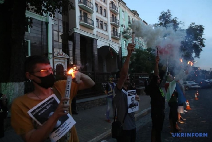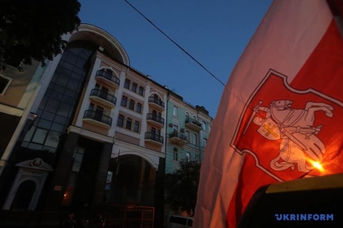 В украинской столице под зданием посольства Республики Беларусь проходит акция солидарности с белорусской нацией, посвященная Дню воинской славы Беларуси, который отмечается 8 сентября.