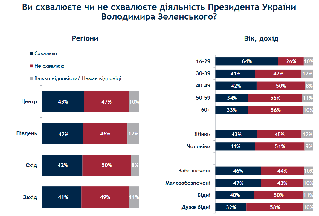 Украинцы преимущественно не одобряют действия власти. Касательно президента Владимира Зеленского мнения разделились примерно поровну.