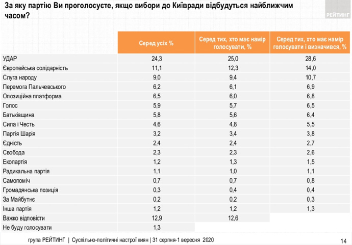Дословно: "В рейтинге политических сил на выборах в городской совет лидирует партия "УДАР" за которую готовы отдать голоса 28,6% тех, кто определился и намерен прийти на выборы".