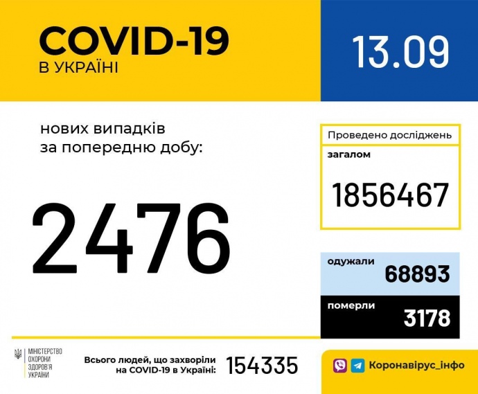 Дословно Минздрав: "13 сентября (по состоянию на 9:00) в Украине 154 335 лабораторно подтвержденных случаев COVID-19, из них 3 178 летальных, 68 893 пациента выздоровели. За сутки зафиксировано 2 476 новых случаев. Всего проведено 1 856 467 тестирований методом ПЦР. Всего за сутки выздоровел 547 пациентов".