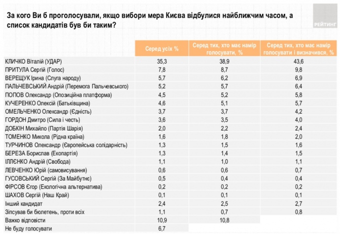 Согласно с ним, за Кличко готовы проголосовать 36% всех опрошенных или 41% тех, кто готов принять участие в выборах и определился, за кого из кандидатов голосовать. На втором-третьем местах по уровню электоральной поддержки — Андрей Пальчевский (соответственно 8% и 9%) и Александр Попов (соответственно 7% и 8%).