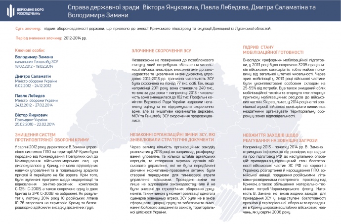В совершении государственной измены подозреваются высшие должностные лица государства того периода - беглый президент Виктор Янукович, министры обороны Дмитрий Саламатин и Павел Лебедев, а также начальник генерального штаба - главнокомандующий ВСУ Владимир Замана".