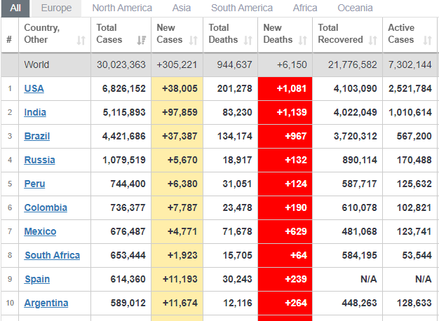 За минувшие сутки в мире коронавирус обнаружили более 305 тысяч человек. Таким образом, за время пандемии зарегистрировано 30 миллионов случаев заболевания.