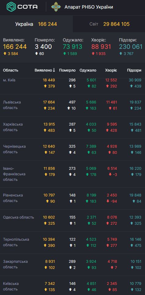 Всего за время пандемии в Украине было выявлено 166 244 человек, заболевших COVID-19, из них 3 400 человек умерли, а 73 913 человек выздоровели. В настоящее время болеют из-за коронавируса 88 931 жителей страны.