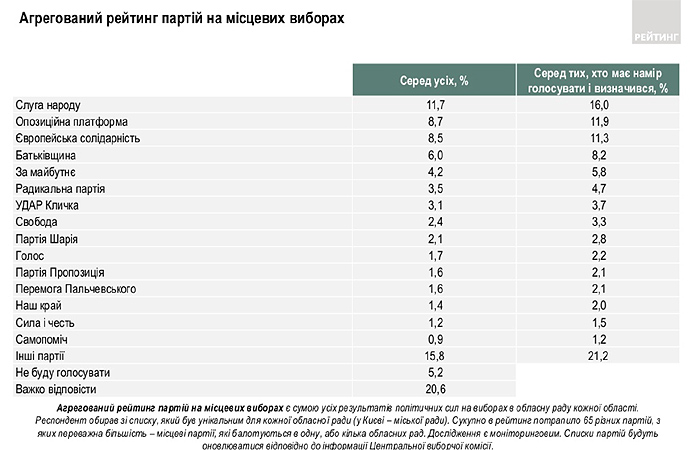 Дословно: "По результатам агрегированного рейтинга партий на местных выборах партию "Слуга народа" на выборах в областные советы готовы поддержать 16% тех, кто определился и намерен прийти на выборы. Партия "Оппозиционная платформа – За жизнь" поддерживают 11,9%, партию "Европейская солидарность" – 11,3%, партию "Батькивщина" – 8,2%".