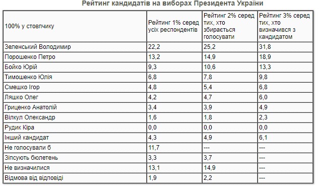 Детали: За пятого президента Украины Петра Порошенко проголосовали бы 18,9% избирателей, 13,3% - за Юрия Бойко, 9,8% - за Юлию Тимошенко, 6,8% - за Игоря Смешко, 6% - за Олега Ляшко, 4,9% - за Анатолия Гриценко, 2,3% - за Александра Вилкула. Других кандидатов проголосовали бы всего 6,1%.