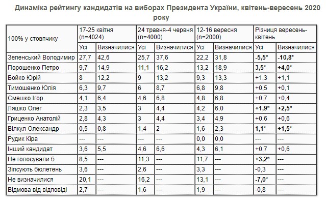 Если бы выборы президента состоялись в средине сентября за действующего президента Владимира Зеленского проголосовали бы 31,8% избирателей, которые уже определились.