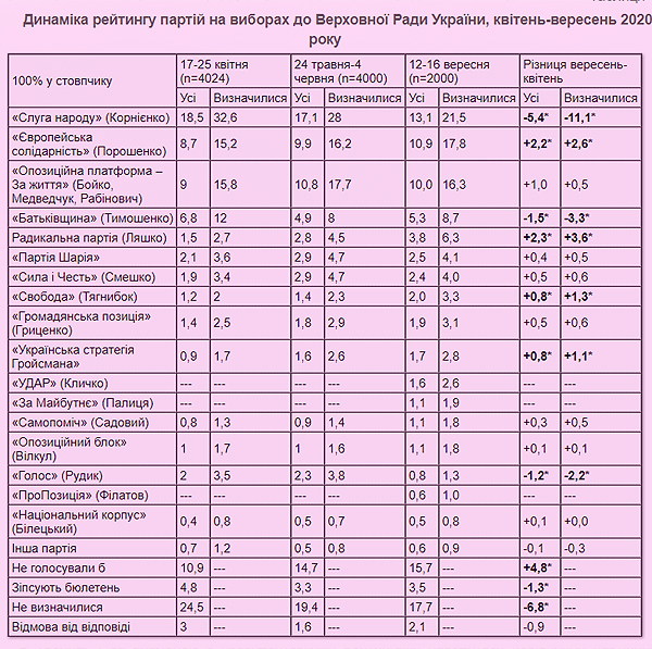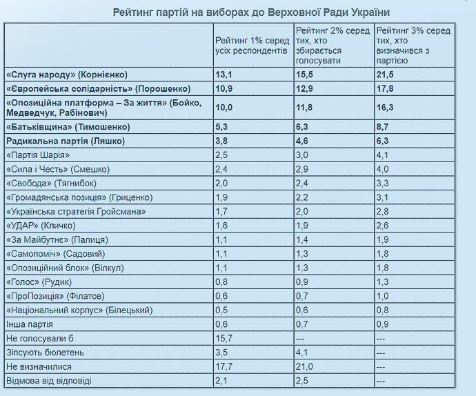 Дословно: "Наибольшие шансы попасть сейчас в парламент, если бы выборы проходили в сентябре, имеют партии "Слуга народа", "Оппозиционная платформа – За Жизнь", "Европейская солидарность", "Всеукраинское объединение "Батькивщина", Радикальная партия Олега Ляшко. Имеют шансы также партия Шария и партия "Сила и честь"".