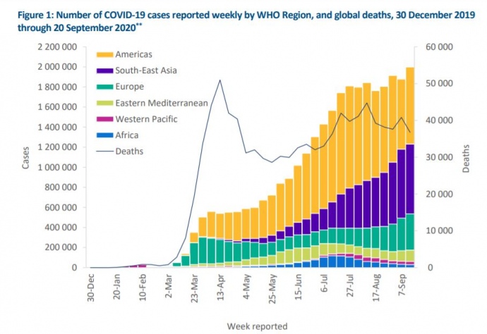 Дословно: "С 14 по 20 сентября было зарегистрировано почти 2 миллиона новых случаев COVID-19, что на 6% больше по сравнению с предыдущей неделей, и является наибольшим количеством зарегистрированных случаев за одну неделю с начала эпидемии".