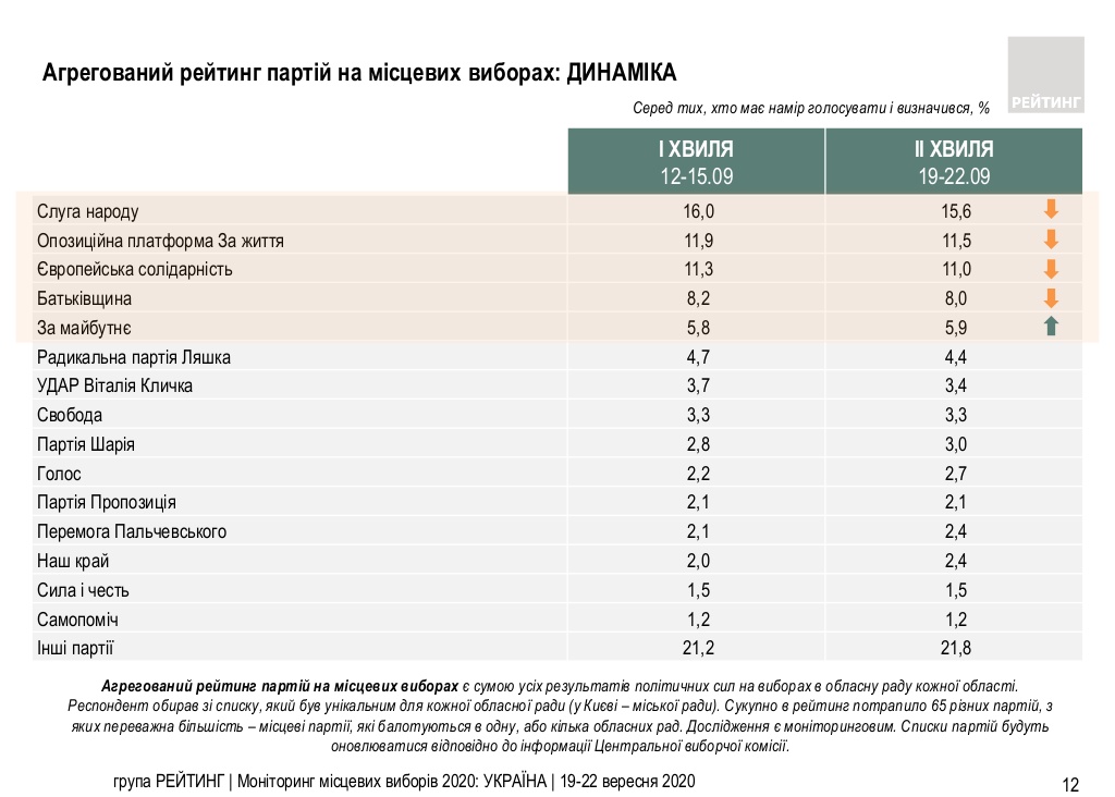 Партию "Голос" поддерживают 2,7% тех, кто определился и пойдет на выборы, партии "Наш край" и "Победа Пальчевского" – по 2,4%, партию мэров "Пропозиція" – 2,1%, партию "Сила и честь" – 1,5%, партию "Самопоміч" ("Самопомощь") – 1,2%.