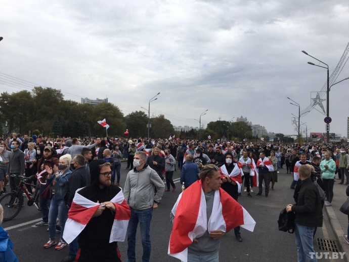 Тем временем, к центру города колоннами сходятся протестующие. Люди собираются в спальных районах и большими группами движутся в направлении стелы "Минск город-герой".
