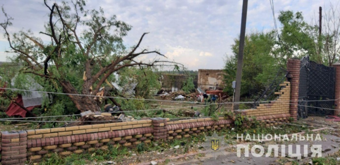 Дословно: "Сегодня в результате урагана и сильной грозы в пгт Великая Александровка повалены деревья, повреждены провода на линиях электропередач и значительно повреждены крыши домов и других сооружений. К счастью, обошлось без жертв.