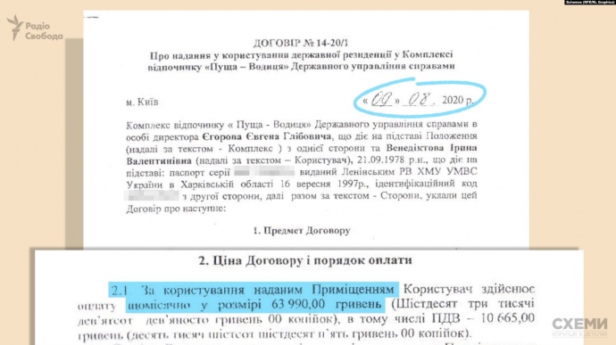 Согласно договору аренды, который "Схемы" получили в свое распоряжение, в июле этого года Венедиктова арендовала дом со специальным статусом государственной резиденции в "Пуще-Водице" общей площадью почти 700 квадратных метров.