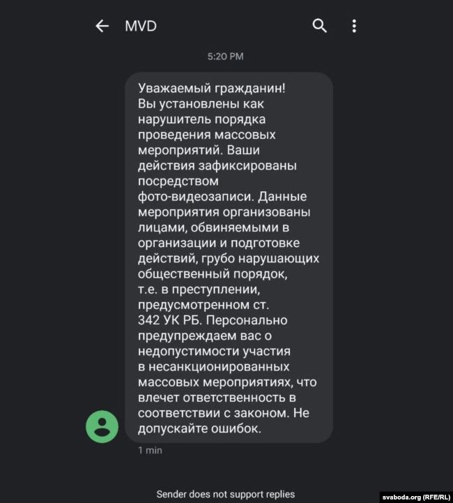 В Беларуси мобильные операторы массово рассылают смс-сообщения от имени МВД с предупреждением о недопустимости участия в несанкционированных массовых мероприятиях.