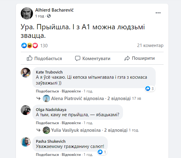 Сообщение получил, например, и известный белорусский писатель Альгерд Бахаревич. Участники акций протеста в соцсетях уже активно шутят по поводу этих смс самопровозглашенной власти.