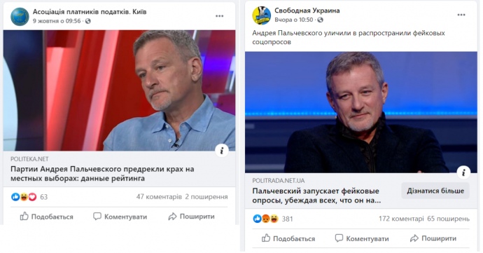 В частности, страницы Свободная Украина и Ассоциация налогоплательщиков.Киев, которые две недели назад распространяли фейковый опрос в пользу Пальчевский, теперь обвинили его в этом и предсказали "крах на местных выборах".