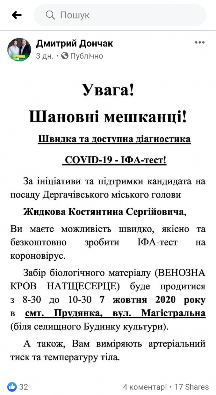Дословно: "По инициативе и поддержке кандидата на должность Дергачевского городского головы Жидкова Константина Сергеевича проводятся анализ крови (ИФА-тест на коронавирус).
