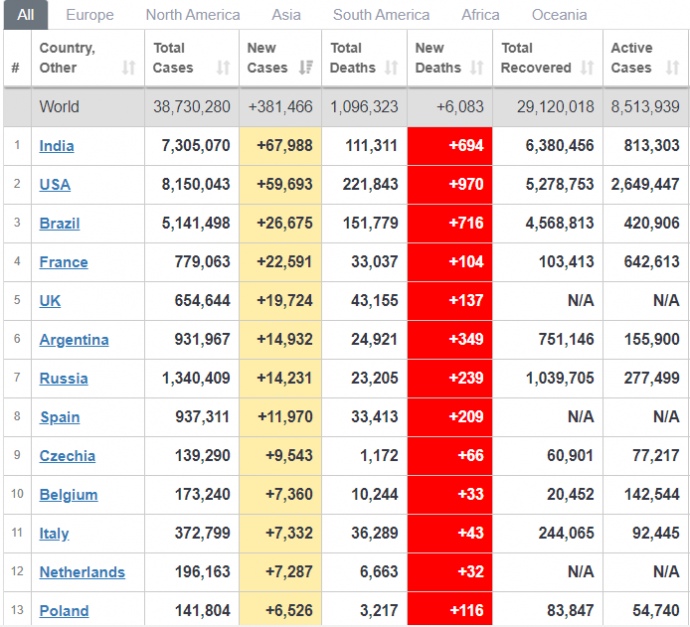 13 октября во мире подтвердили более 381 тысячи новых случаев коронавируса – это наибольшее количество выявленных заражений за сутки за время пандемии.
