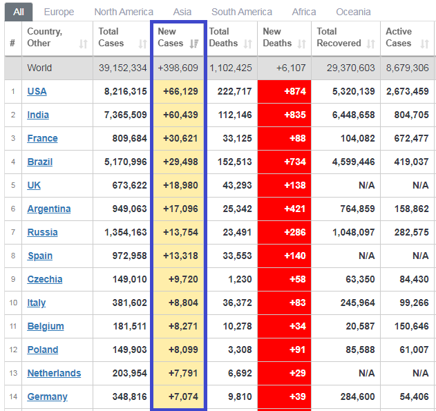 По состоянию на момент публикации, в мире зафиксировано 39,1 миллионов случаев заражения. Успешно перенесли болезнь и вылечились 29 миллионов человек. 1 102 318 пациентов умерли.