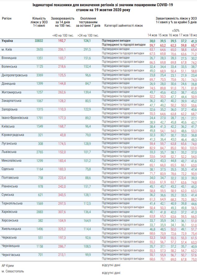По состоянию на 19 октября ни одна область в Украине не готова к ослаблению карантина из-за распространения COVID-19.