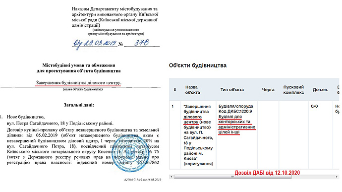 Дословно: "Разрешение выдано на "Завершение строительства делового центра (новое строительство) на улице Петра Сагайдачного, 18 в Подольском районе г. Киев" (корректировка)"".