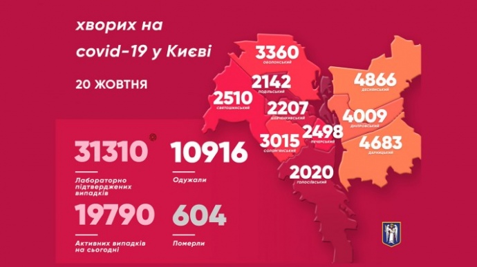 Подтвержденных случаев заболевания COVID-19 по состоянию на 20 октября в столице уже 31 310, всего коронавирус преодолели 10 916 жителей Киева, болезнь унесла жизни 604-х киевлян.