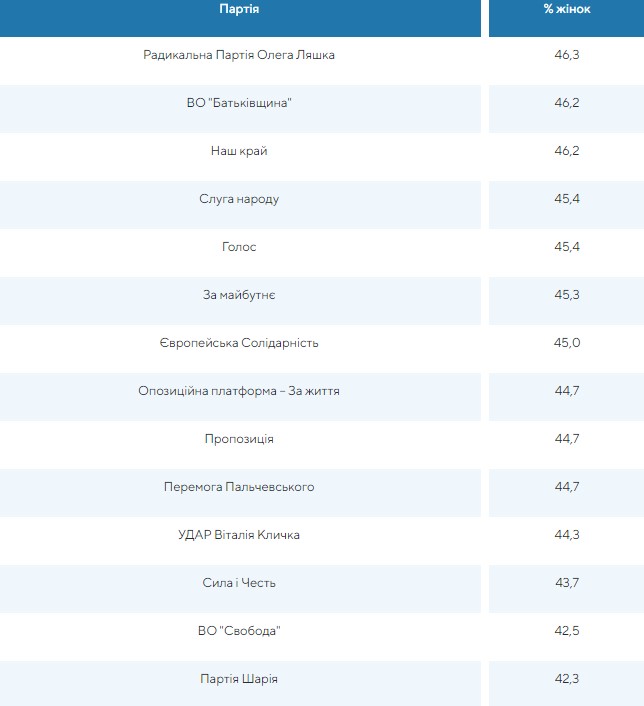 Среди ряда политических сил процент женщин в списках кандидатов практически одинаков и колеблется от 42% до 46%".