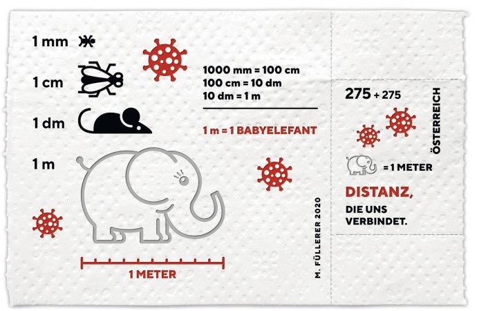 "Коронамарка" стоимостью 2,75 евро выпускается в листах шириной 10 см, или десятой части 1 метра. Это дистанция, которую правительство советует держать друг от друга, и которую в официальных кампаниях символизирует слоненок.